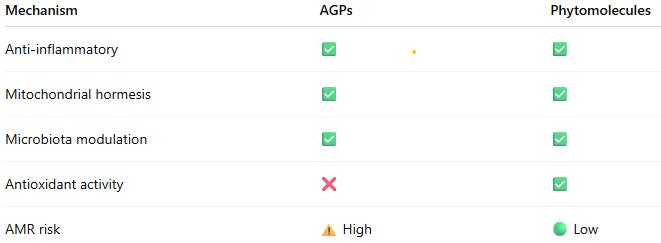 When properly standardized and formulated for controlled release, phytomolecules deliver growth promotion, feed efficiency improvements, and disease resistance comparable to AGPs, while potentially offering advantages in AMR risk profile, stress resilience, and consumer acceptance.